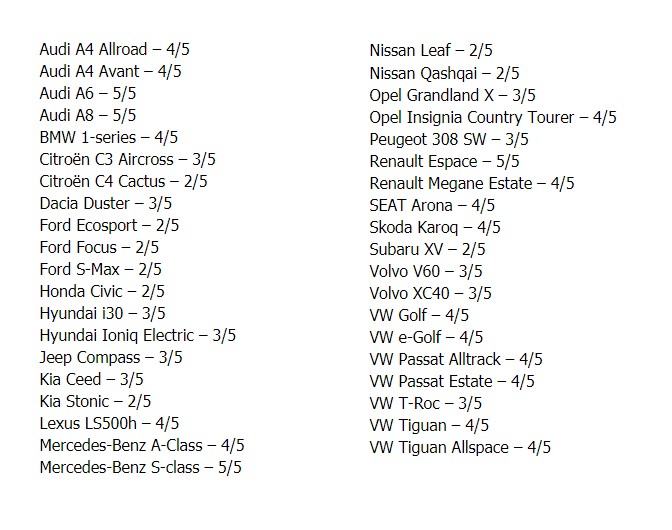 Одним з лідерів стала Audi, наприклад, А6 отримала максимум. Проте, A4 оцінили на бал нижче, через недоліки у внутрішній обробці деяких кузовних елементів.