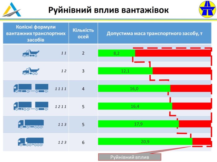 Сучасні великовагові вантажні транспортні засоби (важкі будівельні самоскиди і т.з. “фури”) можуть значно перевищувати нормативне навантаження. Це суттєво збільшує руйнівний вплив і зменшує нормативний строк служби автодороги.