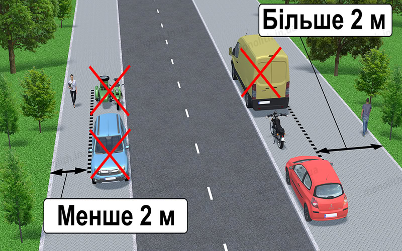 в) на тротуарах, за исключением легковых автомобилей и мотоциклов, которые могут быть поставлены на край тротуара при условии, что для движения пешеходов остаётся не менее 2 м;