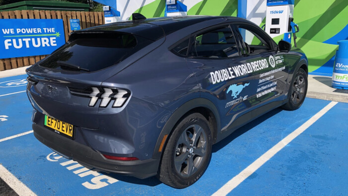 Кроссовер Ford Mustang Mach-E Extended Range RWD установил рекорд по дальности пробега на одном киловатт-часе, попав в Книгу рекордов Гиннесса. В электрокаре в это время находилось трое человек, среди которых был корреспондент BBC Пол Клифтон. Интересно то, что целью поездки была скорее демонстрация возможностей запаса хода электрокара по сравнению с топливными моторами, нежели установление рекорда.