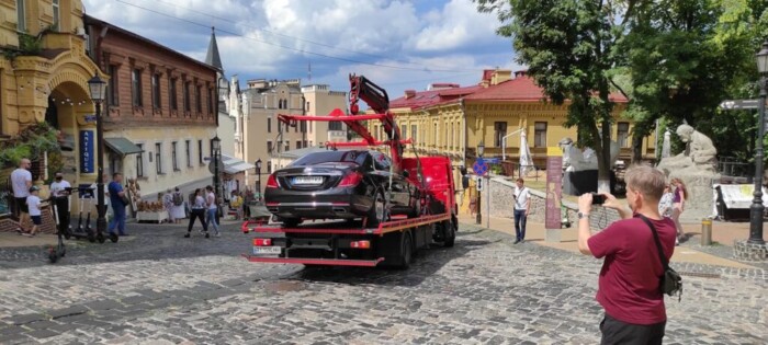 Водитель припарковал свой автомобиль прямо возле Андреевской церкви. Но это пешеходная улица, поэтому машину забрали на штрафплощадку.