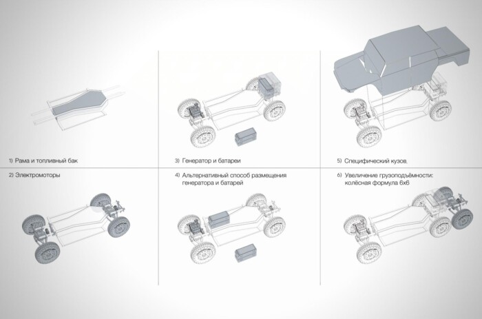 При необходимости, часть объема в раме можно заполнить водой (например, для спасательных служб). Это уменьшит запас хода, но он все равно останется невероятно большим. От тяговой батареи можно запитать специальное оборудование. Дизельный мотор можно заменить на водородный электрохимический генератор, и тогда модель станет полностью экологически чистой. И это не все возможности кастомизации внедорожника.