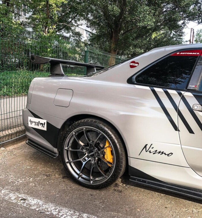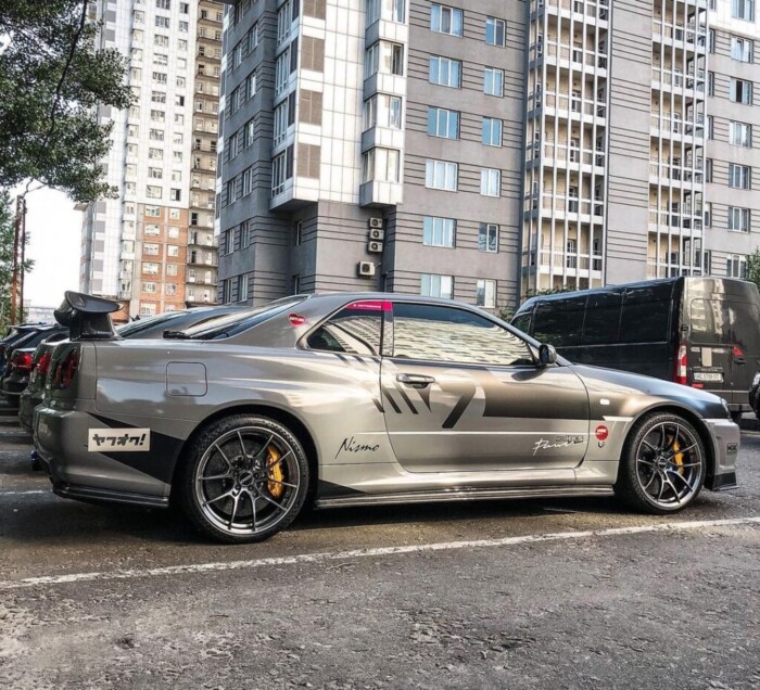Этот экземпляр выпущен в 1999 году, а полное название — Nissan Skyline GT-R34. Обычно под капотом находится 2,6-литровая турбированная «шестерка» мощностью 280 л.с., но автомобиль тюнингованный, поэтому отдача двигателя увеличена.