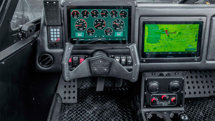 Клиренс достигает внушительных 508 мм. В салоне находится необычный штурвал, кожаные сидения Recaro и два 12-дюймовых экрана: приборной панели и системы мультимедиа. Также водителю Ripsaw EV3-F4 доступна система ночного видения.