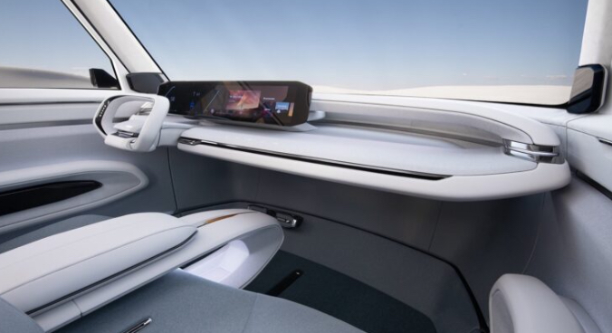 В салоне имеется футуристичный прямоугольный руль, 27-дюймовый экран мультимедиа и возможность поворота всех сидений на 180 градусов.