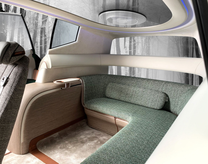 Колесная база автомобиля составляет 3,2 м, что положительно сказалось на пространстве в салоне. Два индивидуальных кресла можно вращать на 360 градусов, а в задней части разместили уютный диван. В отделке салона использованы экологически чистые материалы. Внутри доступно множество полочек, ящиков и даже имеется холодильник.