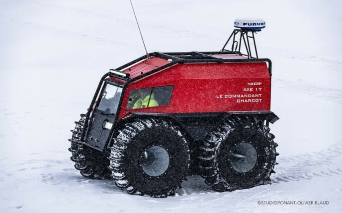 Снегоболотоход доставили на Северный полюс на специальном ледоколе Le Commandant Charcot. Автомобиль дополнительно оснастили твердотельным радаром норвежской марки Furuno, который выглядит как «сковородка» на крыше.
