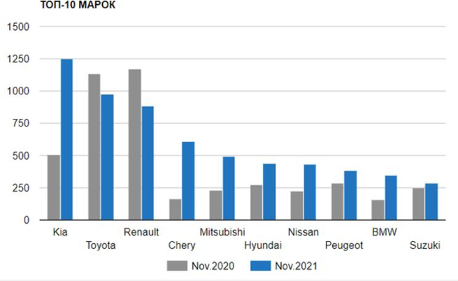 Неожиданным стало то, что компания Chery, которая в прошлом году с большой натяжкой входила в топ-10, в 2021-м заняла 4 место по количеству продаж. Закрывает пятерку бренд Mitsubishi с 494 проданными авто в ноябре 2021.