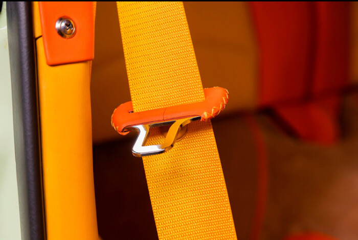 Автомобиль окрашен в яркий желтый цвет кузова и имеет двухцветный интерьер, который выполнен в оранжевых и желтых оттенках, а также сочетается с большим количеством деревянных панелей коричневого цвета. А вот коврики на полу и вставки в дверях имеют бежевый оттенок.