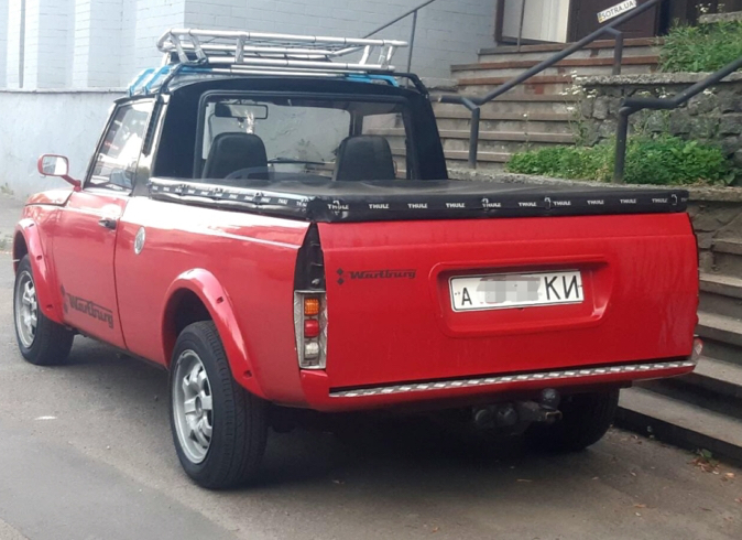 Судя по фото, перед нами Wartburg 1.3, одна их последних моделей фирмы, которая производилась с октября 1988 по апрель 1991 года. Машина предлагалась в трех кузовных вариантах: седан, универсал и пикап. Последний выпускался под маркой Trans и считается очень редким, так как из 152,7 тыс. выпущенных Wartburg 1.3 «коммерсантов» изготовили всего 920 штук.