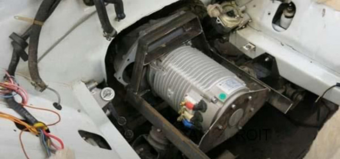 Под капотом спрятан электрический двигатель – трехфазный асинхронного типа, мощностью 10 киловатт, он питается переменным током номинальным напряжением 96 вольт. Обороты двигателя регулируются путем изменения частоты тока, за это отвечает электронный акселератор и контроллер, коммутирующий ток до 500 ампер.