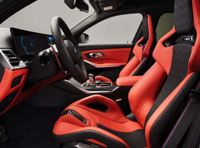 Салон BMW M3 Touring отделан кожей и карбоном. Автомобиль получил спортивный руль и удобные передние сиденья с хорошей боковой поддержкой. Как и у всех BMW 3 Series 2023, на передней панели установлен новый изогнутый дисплей, причем его графика у М3 особенная.
