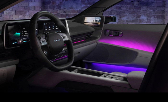 В салоне будет расположен характерный прямоугольный экран, сочетающий в себе приборную панель и тачскрин мультимедиа, а также «приплюснутый» руль.