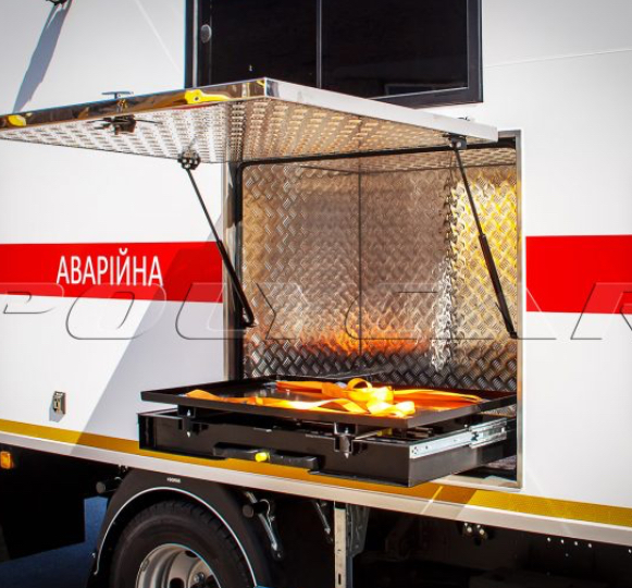 Второй отсек – технический и служит для перевозки специнструмента. Он имеет регулируемые по высоте стеллажи, освещение от бортовой сети, а также кронштейны для крепления ограды. В отсеке предусмотрены технологические ниши для перевозки генератора, мотопомпы и газовых сварочных баллонов.
