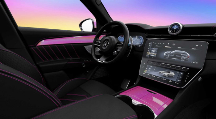 Особенность первого Maserati Grecale Barbie – розовый кузов с кислотно-желтыми бликами на капоте, решетке радиатора и в нижней части переднего и заднего бамперов. Также у кислотно-желтый окрашенный трезубец Maserati. Переливающее лакокрасочное покрытие создает эффект радуги. Передние крылья кроссовера украшают надпись «Barbie», а на задних стойках крыши красуется прописная буква «B». Ездит «кукольный» Grecale на черных многоспицевых колесных дисках с ярким трезубцем по центру.