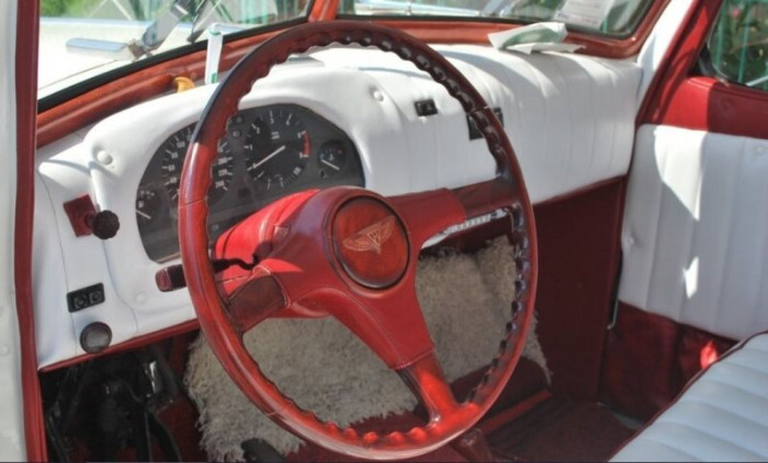 Автомобиль отреставрировали, салон перетащили белой кожей и ковролином. Установили деревянный руль.