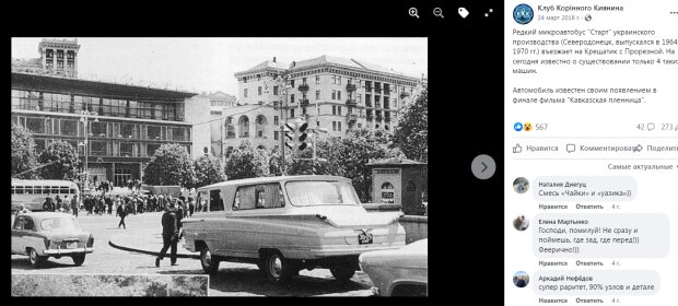 «Редкий микроавтобус «Старт» украинского производства (Северодонецк, выпускавшийся в 1964-1970 гг.) въезжает на Крещатик из Прорезной. На сегодняшний день известно о существовании только 4 таких машин. Автомобиль известен своим появлением в финале фильма «Кавказская пленница»
