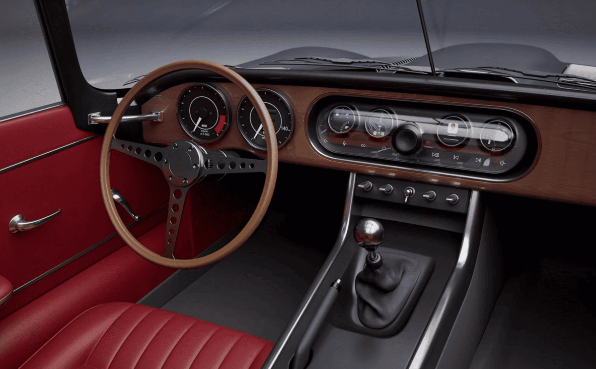 В салоне нового Jaguar E-Type доминирует ретро-стиль — классические циферблаты приборов и тумблерные переключатели остались в первозданном виде. В отделке использованы кожа и дерево, что придаёт автомобилю роскоши и статуса.