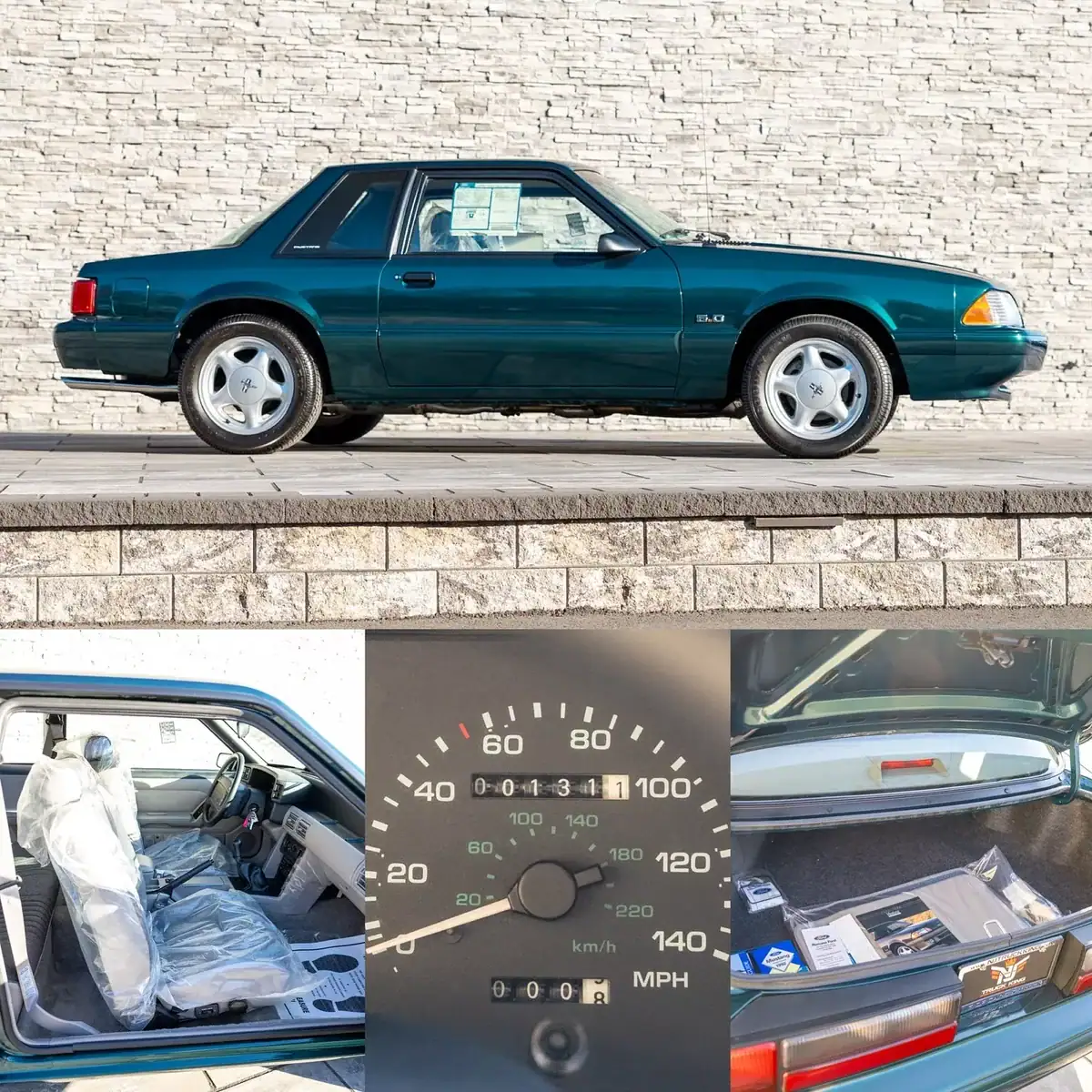 Продажа состоялась через дилера NJ Truck King в Нью-Джерси. На фото видно, что кузов темно-зеленый, краска блестит, как в салоне. Даже сиденья не видели пыли, потому что остались под заводским пластиком. Авто почти не эксплуатировали, и оно стало своеобразной «капсулой времени» эпохи Fox-body Mustang.