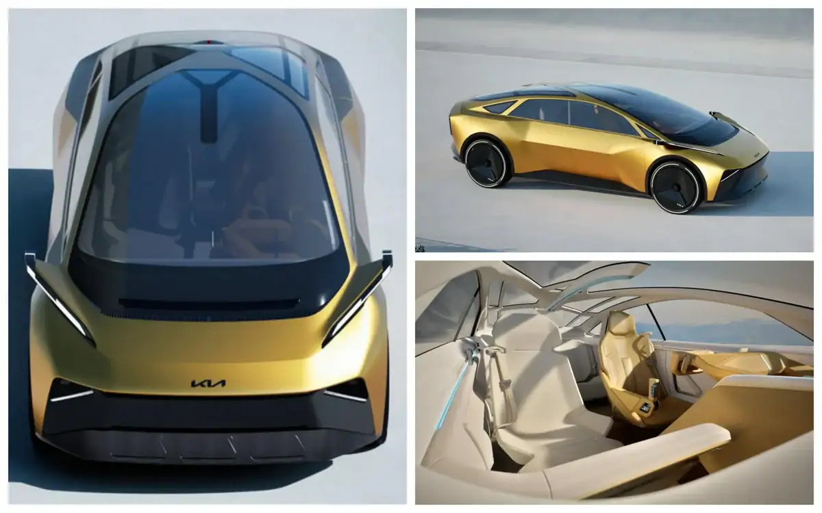 Судя по всему, Kia постепенно отказывается от своей фирменной решетки радиатора. Спереди преобладают острые линии и изящная оптика. Экстерьер дополняют широкие выступы, в которых спрячут камеры и датчики, заменившие зеркала заднего вида. Огромное лобовое стекло займет место от панорамной крыши до самого носа.