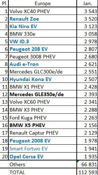 Полностью электрические транспортные средства (BEV) проданы в Европе за январь в количестве 47 000 штук, что на 18% больше в годовом исчислении и составляет 5,6% доли рынка. Зарядных гибридов (PHEV) продано 65 000, что означает увеличение доли рынка на 85% и 8,4%.