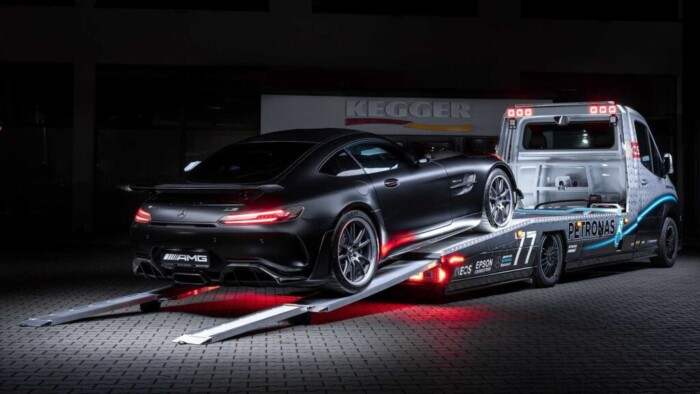 Этот Mercedes Sprinter предназначен для эвакуации суперкаров, отсюда и соответствующий вид. Он оснащен аэродинамическим обвесом и 18-дюймовыми дисками. Воздухозаборники в переднем бампере увеличены. Кузов машины окрасили в стиле расцветки гоночной команды Mercedes в Формуле-1.