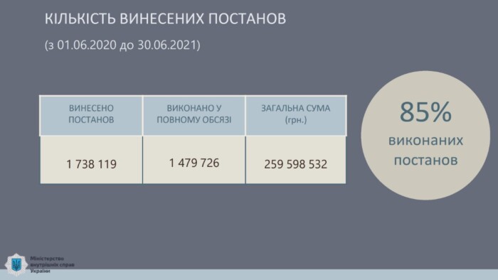 За год вынесено свыше 1,7 млн. постановлений о нарушениях и 85% штрафов уже оплачены. Государственный бюджет получил почти 260 млн грн.