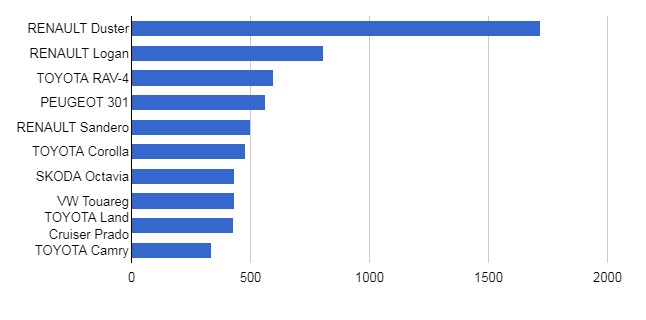 Затем идет компактный кроссовер Toyota RAV-4, который приобрели в размере 2 535 экземпляров. Замыкает тройку Nissan Qashqai – 1 119 регистраций.