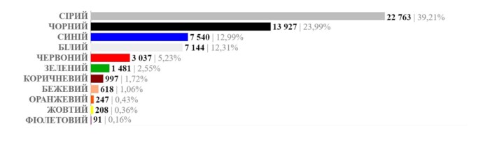 Ввозили тоже преимущественно серые авто (23 000) и черные (24 000). Также оказалось 7 500 синих машин. Не нашли популярности снова оранжевый (247), фиолетовый (91) и желтый (208) цвета.