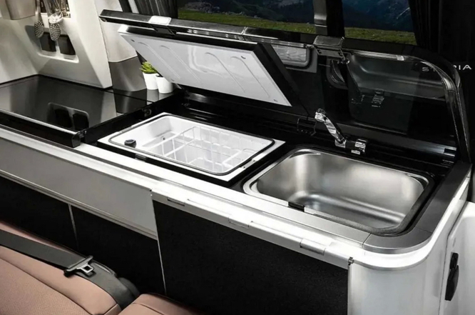 В четырехместном кемпере есть крутая кухня и модуль для хранения. Там размещен холодильник, раковина, резервуар для воды на 70 литров, бак для отходов съемная насадка для душа и складной стол.