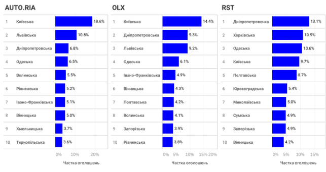 Если сравнивать маркетплейсы, то в AUTO.RIA и OLX лидирует Киевщина, а на RST – Днепропетровская область. В целом на AUTO.RIA доля западных областей Украины больше, чем на других ресурсах. На OLX больше автомобилей, продающих в центральных областях, а на RST больше всего предложений из восточных регионов.