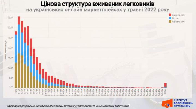 На AUTO.RIA превалируют автомобили стоимостью от $3 до $8 тысяч (39,8%). После последней отметки количество объявлений резко сокращается. При этом именно на этом ресурсе наибольшая доля транспортных средств ценой свыше $50 тысяч — 2,1% от общего количества объявлений. Средняя медиа цена авто на ресурсе составляет около $8 тысяч.