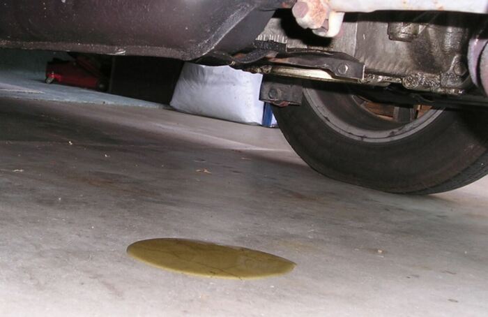 Изначально машинное масло чаще всего золотистое или почти прозрачное, но в ходе работы оно становится черным или коричневым. Следовательно, появление пятен такого цвета под машиной означает утечку масла. Если она небольшая, то ездить можно, однако все равно необходимо обратиться в автосервис.