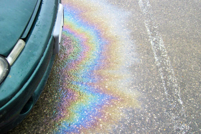 Если лужица переливается всеми цветами радуги и имеет резкий запах, то очевидна протечка в топливной системе. Если проблему не устранить, то она может повлечь за собой еще большие неисправности.