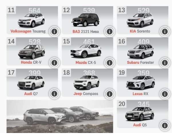 На следующих позициях расположились автомобили Hyundai Tucson, Mitsubishi Outlander, Nissan Qashqai/Rogue Sport. Замыкает пятерку Hyundai Santa FE.