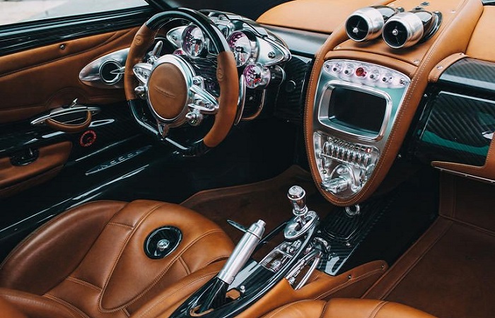 Сидіння обтягнуті м’якою, але дуже міцною шкірою. Родзинкою Huayra є металевий важіль КПП: зроблений з 67 відкритих частин, він дає водієві уявлення про внутрішню роботу механізму кожен раз, коли той перемикає передачі.