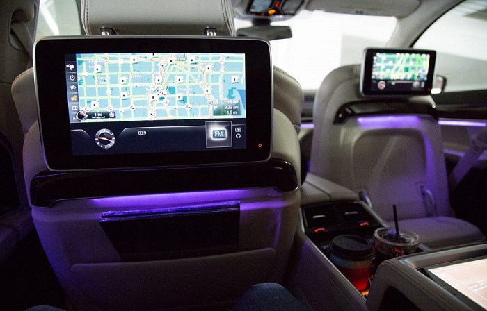 Серед цікавих штучок на задньому ряду — центральний підлокітник з додатковим вхідним роз’ємом, док-станція для iPod, порт USB і пара величезних сенсорних екранів, що кріпляться до спинок передніх крісел.