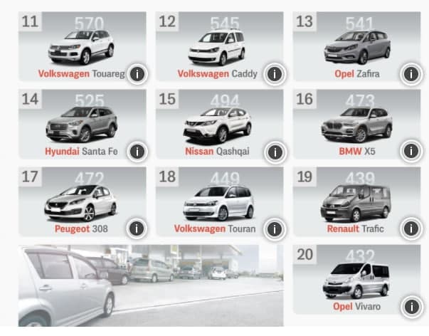 Лидирующие модели тоже не изменились. Чуть меньше было продано экземпляров Renault Trafic, и немного увеличились продажи Volkswagen Tiguan и Volkswagen Touareg.