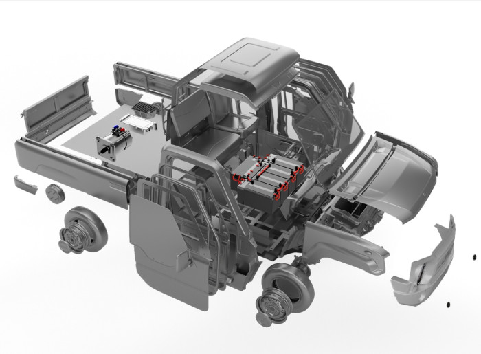 Электромобиль имеет рамную конструкцию, независимую подвеску на передних колесах, а панели кузова изготовлены из металла.