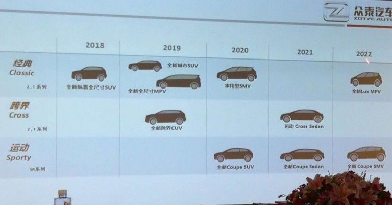 Авто на слайді розбиті на категорії Classic, Cross і Sporty. Їх назви говорять самі за себе. Найближчі п’ять років Zotye представить два кросовера і три мінівена.