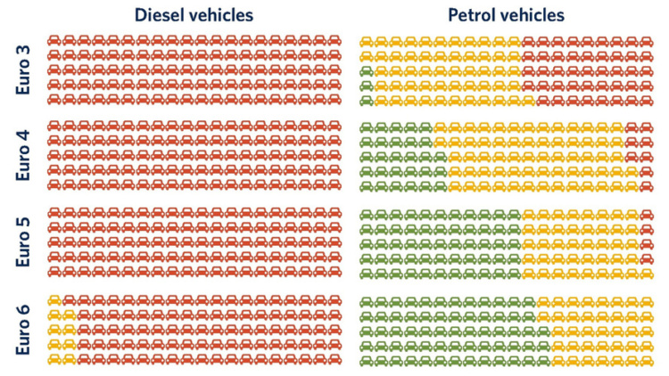 База даних Real Urban Emissions Initiative (True) опублікувала рейтинги, що відображає викиди оксидів азоту (NOx) в реальному часі. Оцінка автомобілів за рівнем викиду шкідливих речовин дається за допомогою колірної схеми «зелений / жовтий / червоний (добре / середньо / погано).