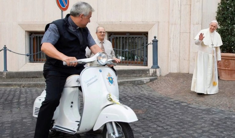 Монарх і суверен Святого Престолу таміста-держави Ватикан, наступник першого римського єпископа святого Петра та верховний ієрарх Католицької церкви – 266-й Папа Римський Франциск отримав у дарунок досить незвичайний “папамобіль”: Vespa 50R.