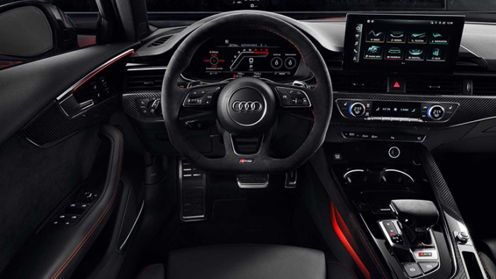 Головна відмінність інтер’єру – новий 10,1-дюймовий сенсорний екран MMI. Оскільки це модель RS, на екрані може відображатися все: від важливої інформації про автомобіль до часу проходження кола.