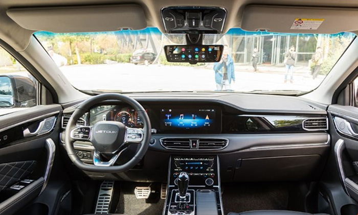 Салон Jetour X95 виконаний в стилі хай-тек. Повністю цифрова приладова панель і величезний сенсорний екран управління новітнім медіакомплексом охоплюють всю фронтальну частину кокпіта практично як на новому Mercedes-Benz GLE. Навіть управління кліматичною системою виведено на окремий сенсорний екран.