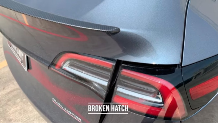 Автор відео повідомляє, що замовив автомобіль Tesla Model Y з доставкою додому. Як виявилось, чимало кузовних деталей підігнані з великими порушеннями допусків, п’яті двері просто відстають від кузова настільки, що енергії сервоприводу не вистачає для її підняття. Крім того, новий власник виявився незадоволений подряпаними колісними дисками, брудним кузовом, наявністю плям на оббивці інтер’єру і подряпин на сидіннях.