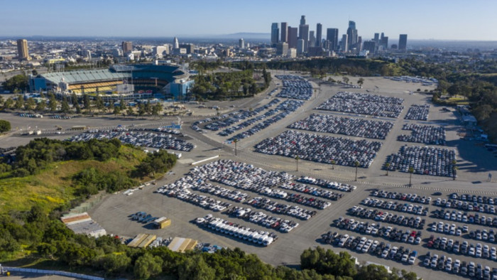 Нагадаємо, що зараз усі спортивні заходи в США скасовані, тому величезні парковки поряд зі стадіонами вирішили використовувати для розміщення машин прокату.