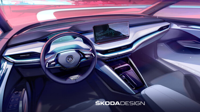 Дизайн салону майбутньої новинки нагадує Octavia четвертого покоління. Електрокар отримає цифрову приладову панель, двоспицеве рульове колесо і 13-дюймовий монітор мультимедійного комплексу.