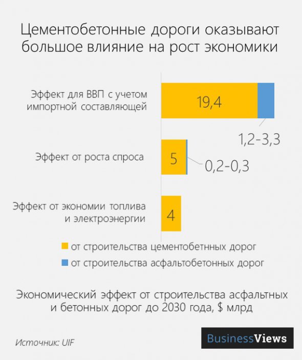 Бетонні дороги мають позитивний ефект на економіку: знижується імпорт бітуму, зростає попит на український цемент, падає споживання палива, знижуються витрати на освітлення доріг через кращу відбивну здатність бетону.