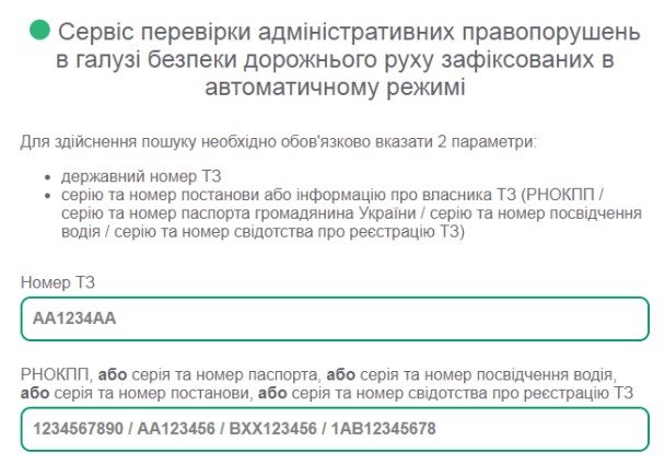 Щоб перевірити наявність штрафів за допомогою цього сервісу, потрібно ввести державний номер ТЗ; серію і номер постанови або інформацію про власника автомобіля.