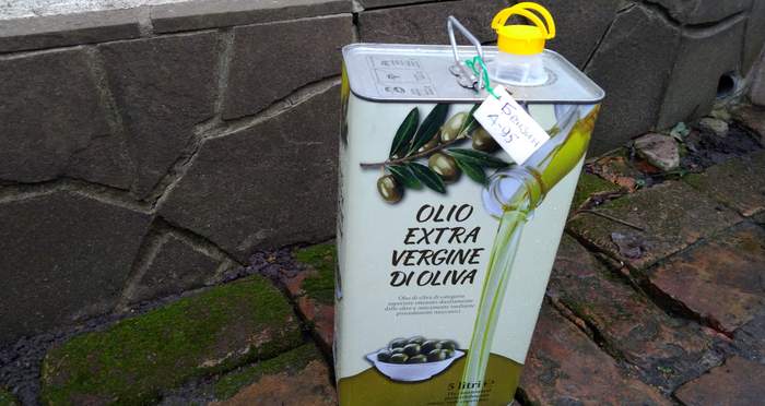 Бляшана тара від оливкової олії. Незважаючи на пластикову горловину, ця 5,0-літрова банка на АЗС визнається металевою тарою. Плюс у тому, що її можна знайти на власній кухні та на кухні найближчого ресторану. Серйозний недолік: через особливості горловини все масло злити неможливо, тому перш за все доведеться ретельно вимити – і бажано тим самим бензином. Важливо: виполіскувати масло водою не рекомендуємо, адже воно обов’язково теж залишиться і врешті-решт потрапить у паливну систему машини. Ще одна можлива проблема – не всі такі каністри вдається потім закрити настільки щільно, щоб у машині не смерділо пальним.